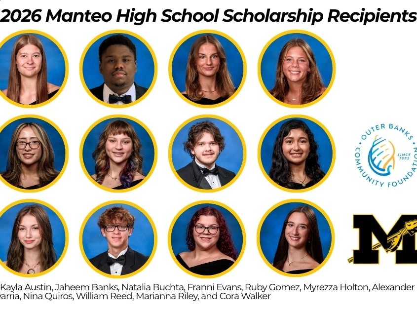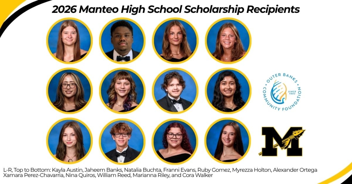 Twelve Manteo High School seniors will start college next fall with financial assistance from Outer Banks Community Foundation funds established by local donors and organizations. Many scholarships will follow these students through all four years of school, as long as they complete the renewability requirements.