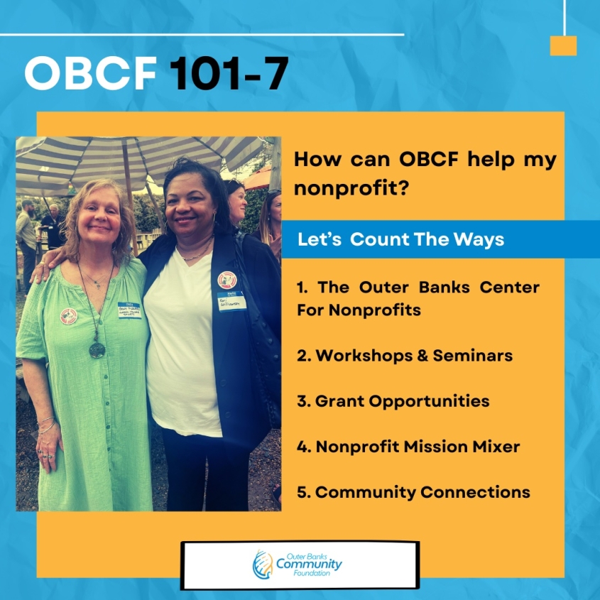 2. We host workshops and seminars specifically designed to give nonprofit professionals tools for success. From marketing to fundraising, we find experts and connect them with our nonprofit community for free educational opportunities that will strengthen our nonprofits. Our next Nonprofit Knowledge Series is a “Messaging Lab” that we have put together with our friends from the Outer Banks Visitors Bureau to help nonprofits tell their story, inspire donors, and strengthen community trust. The event will be held on Friday, September 26 at College of The Albemarle. This event is free for nonprofit board members, staff, and volunteers, but please pre-register online here: https://obcf.fcsuite.com/erp/