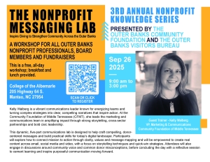 2. We host workshops and seminars specifically designed to give nonprofit professionals tools for success. From marketing to fundraising, we find experts and connect them with our nonprofit community for free educational opportunities that will strengthen our nonprofits. Our next Nonprofit Knowledge Series is a “Messaging Lab” that we have put together with our friends from the Outer Banks Visitors Bureau to help nonprofits tell their story, inspire donors, and strengthen community trust. The event will be held on Friday, September 26 at College of The Albemarle. This event is free for nonprofit board members, staff, and volunteers, but please pre-register online here: https://obcf.fcsuite.com/erp/