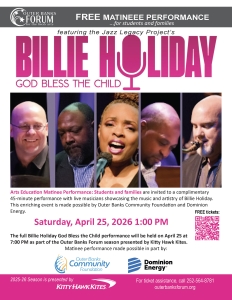 In addition to the evening show, the Outer Banks Forum is hosting a free matinee performance of The Billie Holiday Story on Saturday, April 25, from 1:00 p.m. to 2:00 p.m. in First Flight High School’s auditorium.